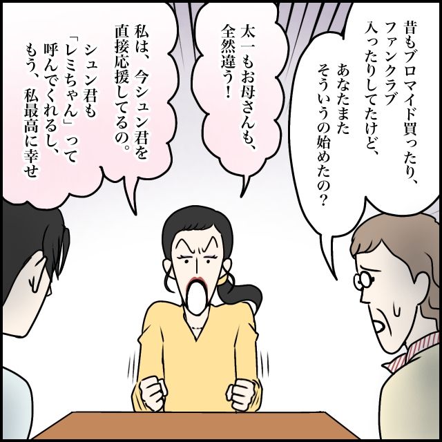 それを聞いた義母は、「昔もブロマイド買ったり、ファンクラブ入ったりしてたけど、あなたまたそういうの始めたの?」と不安そうな表情を浮かべます。すると玲美さんは机をバンと叩き、「太一もお母さんも全然違う!私は今シュンくんを直接応援してるの、シュンくんも『レミちゃん』って呼んでくれるし、もう私最高に幸せ」と興奮気味に言いました。