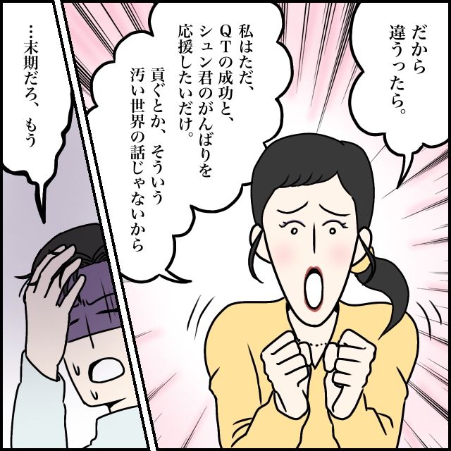 しかし、玲美さんは「だから違うったら!私はただQTの成功と、シュンくんのがんばりを応援したいだけ!貢ぐとかそういう汚い世界の話じゃないから」と、自分はあくまでも応援しているだけと主張します。太一は、そんな玲美さんを見て「・・・末期だろ、もう」と頭を抱えました。