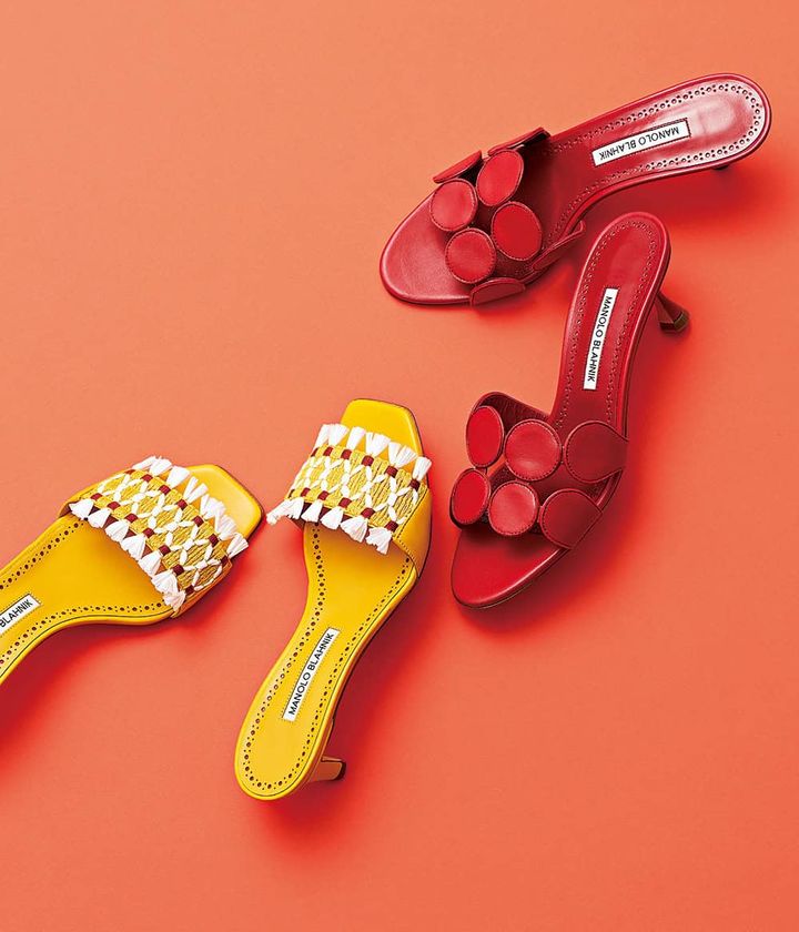 〈右から〉サンダル「HARIBALMU」〔H5㎝〕¥167,200サンダル「MOREMU」〔H5㎝〕¥163,900(ともにマノロ ブラニク/ブルーベル・ジャパン)
