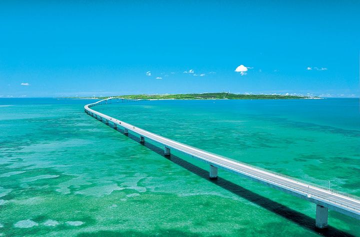 宮古島と伊良部島を結ぶ全長3540mの橋。離島同士を結ぶ橋として、また無料橋として日本最長。道路橋としても日本で4番目の長さを有します。橋の最高部は27mの高さがあり、周囲に広がる宮古ブルーの海を見渡すドライブルートとしても人気。また伊良部島側の袂の高台にある「いらぶ大橋 海の駅」から眺める橋の全景も見応えがあります。