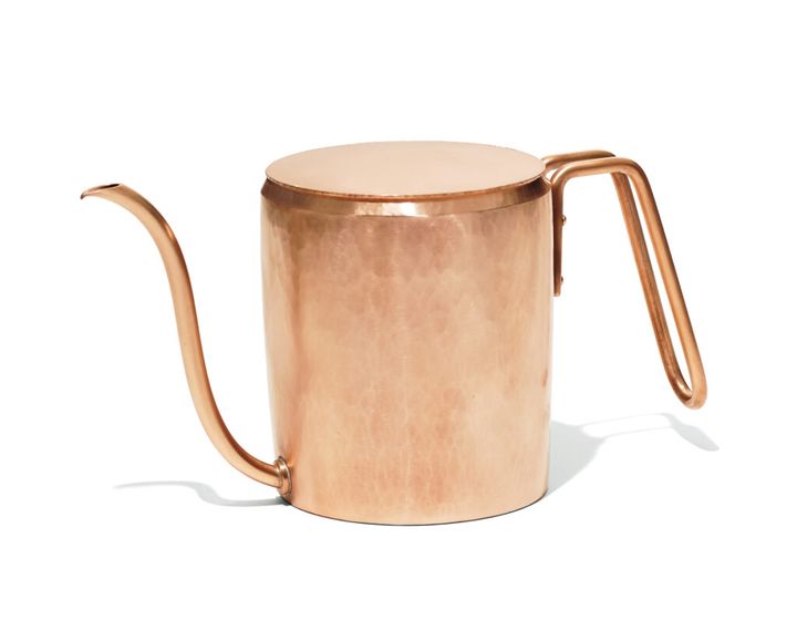 主に金属を用いて日用品やオブジェを作る中根嶺による銅製のケトルは、一枚の銅板から手打ちで形成されている。湯量を制御しやすい細い注ぎ口で、繊細なドリップを手助けしてくれる。また、単なる道具としてだけでなく、空間に馴染むデザイン性も意識した雰囲気のある一品。[800㎖]¥104,500(Ren info@ren-craftwork.com)