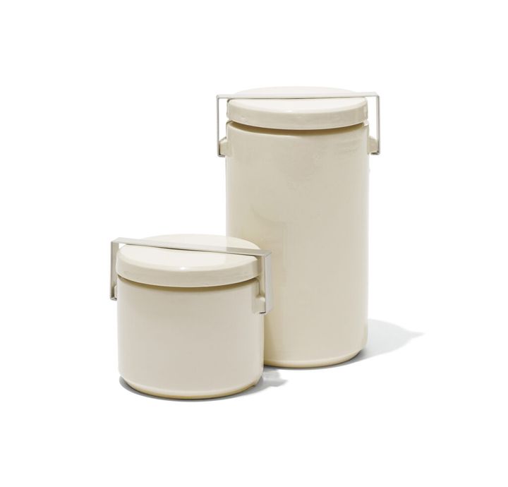東京を拠点に作陶する陶芸家のキャニスターは、軽さも特徴。磁土と陶土をミックスした半磁土に貫入の入らない光沢のある透明釉が掛けられている。密閉できるので豆の保存にぴったり。右/キャニスターHIGH iw−3[約W97×D85×H150㎜]¥16,500、左/キャニスターLOW iw−2[約W93×D80×H73㎜]¥13,200(ともに季の雲 0749−68−6072)