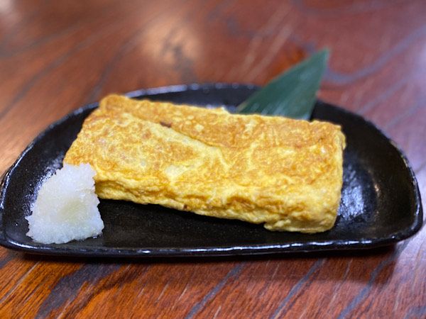 【だし巻玉子】 お出汁をたっぷり含んだ、ほんのり甘くてぷるぷるの卵焼き。添えられた大根おろしと食べるのもたまりません。