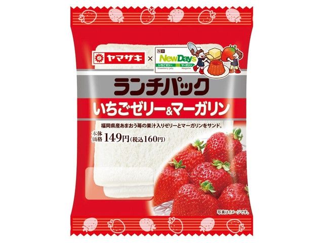 福岡県産あまおう苺の果汁入りゼリーとマーガリンをサンドしました。 ニューデイズ首都圏及び静岡・長野・新潟・宮城・福島・山形・岩手