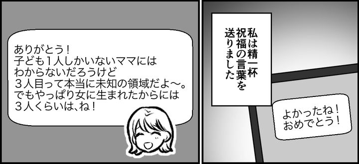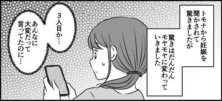 トモナから「3人目を妊娠中」と聞かされて、驚いてしまった私。その驚きはだんだんモヤモヤに変わっていきました。それでも精一杯の祝福の言葉を送りました。トモナからの妊娠フィーバーともとれるような3人目マウントのメッセージが次々に送られてきます。少しイラっとしたのでこの日は返信しませんでした。