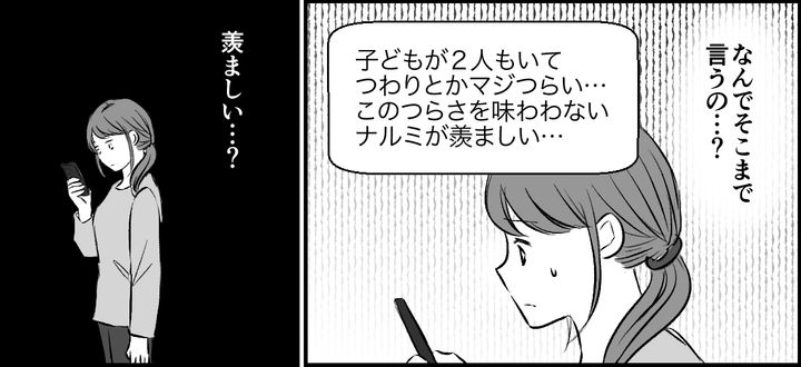 私が既読スルーをしても、トモナは毎日のように連絡してきます。その内容は、1人しか子どもがいない私に対しての嫌味ともとれるようなマウントばかり。私だって子どもがもっと欲しかったけれど授からなかっただけなのに。