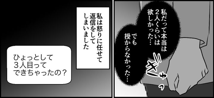その後、つわりがひどいと愚痴をこぼす彼女にカッとなった私は、「ひょっとして、3人目って“できちゃった”の?」と意地悪な質問をしてしまいました。