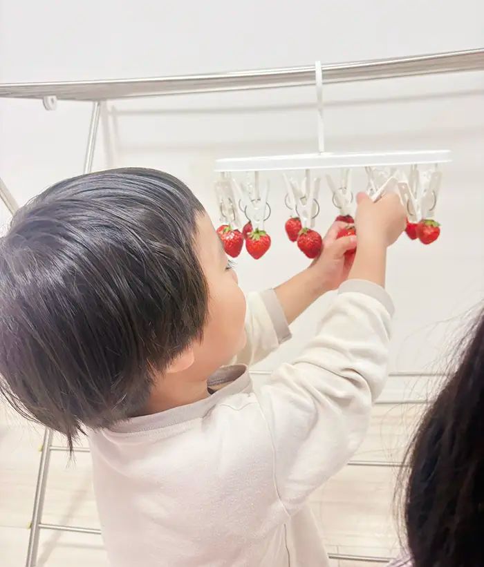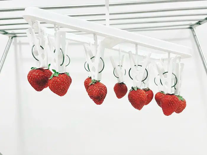 洗濯ハンガーには、たくさんのイチゴがぶら下がっています。娘さんたちは、本物のイチゴ狩りと同様に、手で摘んで、その場で食べることができるのです!