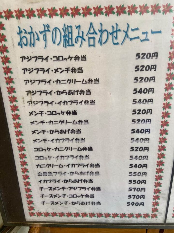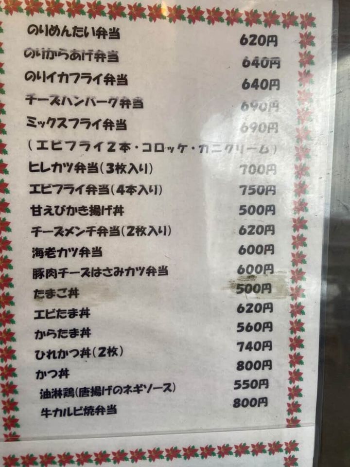 女性・男性ひとりでも訪問しやすい雰囲気のお弁当屋さんです。とてもお弁当や丼の種類が豊富でした。唐揚げ弁当、ミックスフライ弁当、のりめんたい弁当・からたま丼・甘えびかき揚げ丼・チーズハンバーグ弁当やアジフライ・コロッケ弁当、コロッケ・イカフライ弁当・白身フライ・からあげ弁当などのおかずの組み合わせお弁当もあります。500円〜800円で購入できるお弁当ばかりですよ。