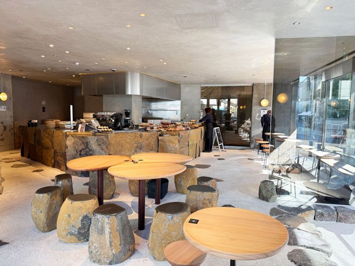 “石の町にある小さなパン屋さん”をコンセプトにする「AMAM DACOTAN」の世界観を引き継ぎ、石と木を組み合わせたインテリアが素敵。テーブルやベンチは木工職人が手作業で仕上げているのだとか。