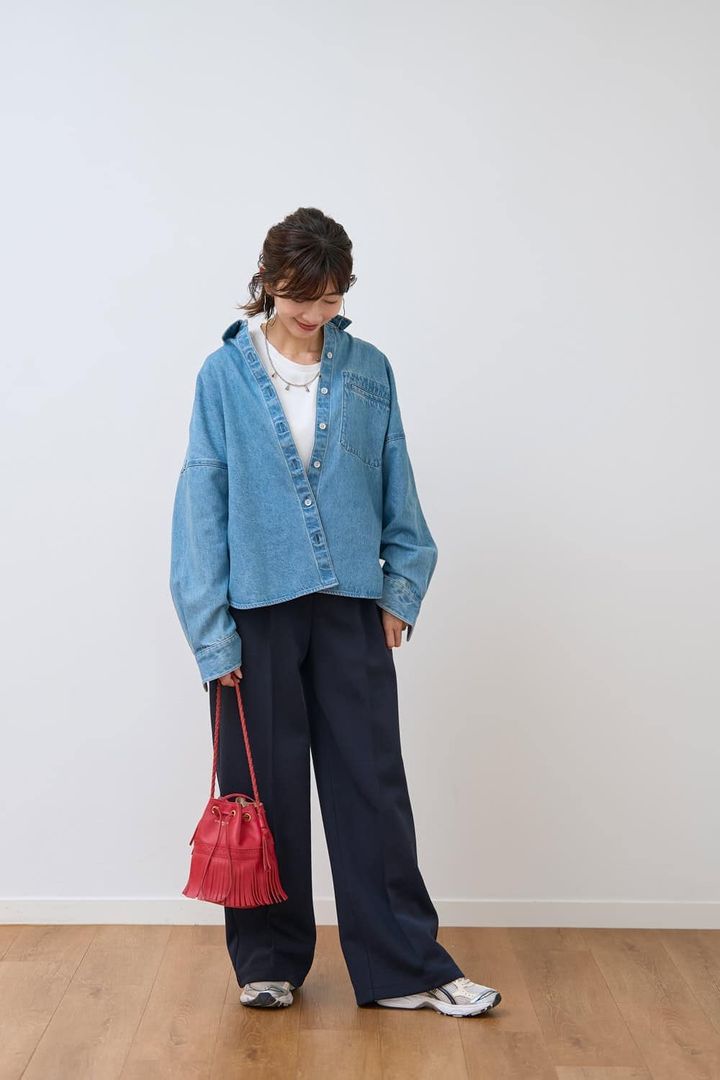 しっかりとしたデニム生地にメタルボタンまで抜かりない仕上がり。サテントップスやきれいめパンツとも好相性で、カジュアルに寄りすぎないのが魅力。ゆったりシルエットで春お出かけにも最適です。