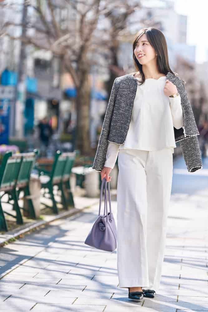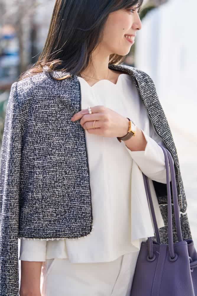 細やかなツイードと控えめにあしらわれた小粒パールが上品さをキープ。ファスナー仕様でほどよくカジュアルに着られて、デニム合わせも◎。オンオフ問わず活躍する万能アウターです。