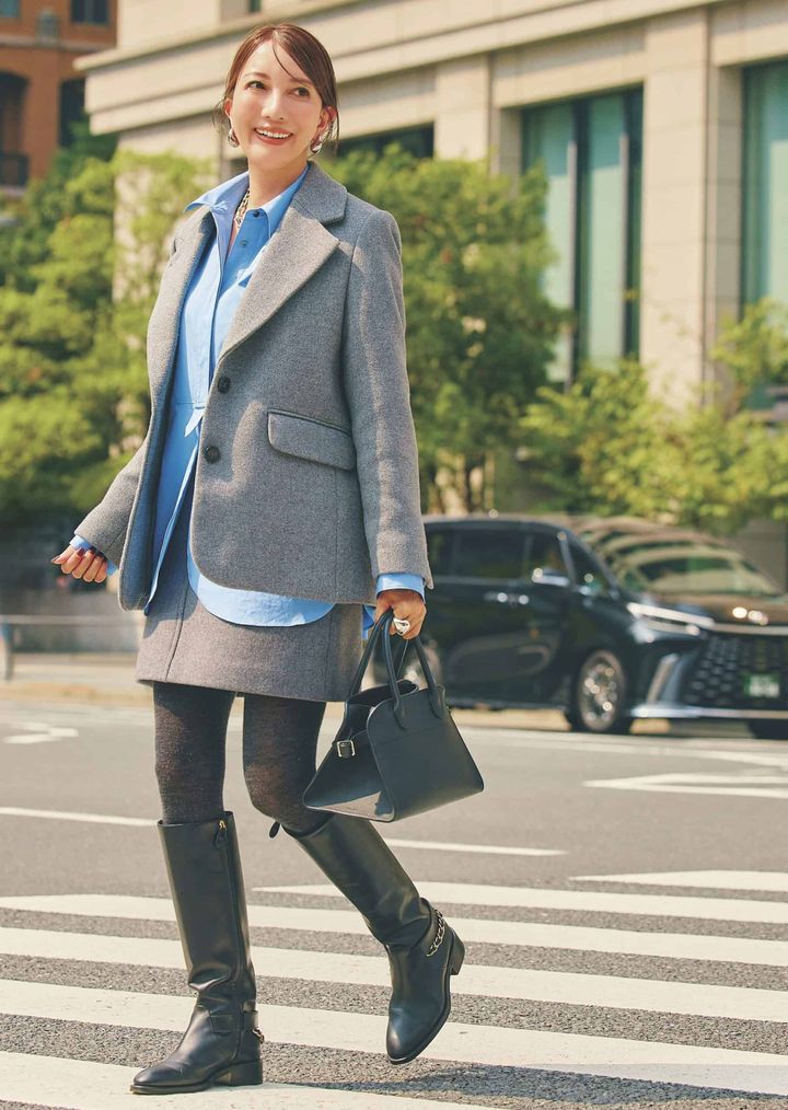 ハリのあるグレージャケットはプチプラとは思えない高見え力。長め丈とゆるやかなシルエットが今っぽく、ミニスカとも好相性。ブルーシャツを合わせて爽やかな好印象コーデに。