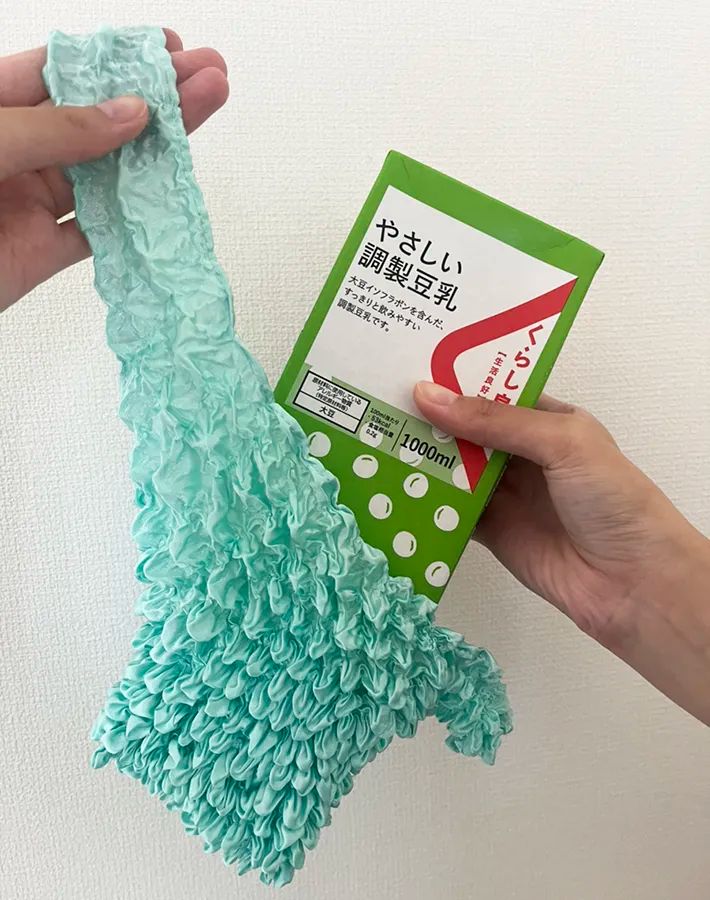 くしゅっとしていた生地が伸びて、豆乳パックがすっぽり収まりました。