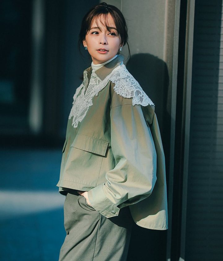 顔周りをパッと華やかに盛り上げる、トレンドのレースが大胆にあしらわれ、まるでブラウスのような感覚で着られる新感覚のジャケット。青みよりの辛口ベージュ×ほんのりオーロラ風に艶めく素材感、前後差のあるオーバーシルエットでモード感も足せる珠玉の一枚。