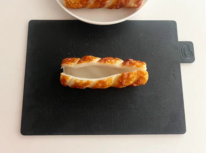 斜めにカットすると、断面からポテトサラダが見えて見た目も華やかですよ。