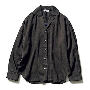 ブラウンスエードシャツブラウス/RIM.ARK(バロックジャパンリミテッド) スエード特有の濃淡と陰影が出ることで、のっぺりと見えがちな色みにも奥行きが誕生。首元で抜け感を出せるオープンカラーは、重厚な色と素材でもすっきり着られ使いやすい。