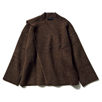 ブラウンスカーフニット/ZARA(ザラ カスタマーサービス) ラップ風になった前身ごろの右肩側がスカーフのように長く、背面にたらして着るユニークなニット。濃ブラウンで落ち着かせながら、バッグスタイルまでも着飾れる。デザインにひとクセあってもミニマルな見た目かつジャストめ丈で、意外ととり入れやすい。