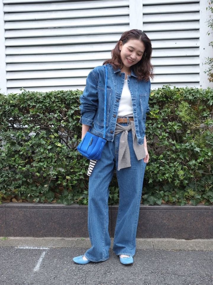 「デニム×デニムの春の王道ファッションに、小物は鮮やかなブルーを合わせることでスタイリングの鮮度を高めました。また、ベーシックなシルエットにこなれ感が出るよう、腰にはボーダーのロングスリーブTを巻いたのもポイントです」
