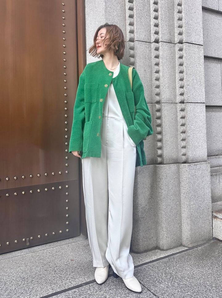 「オーラリーの鮮やかなグリーンのジャケットを主役に。とろみと光沢感のあるオールインワンと、あえて対極な要素を合わせました。異素材のコントラストが、リラックス感のなかに都会的な女性らしさをもたらしてくれます。足元までワントーンで繋げてクリーンにまとめることで、スタイルアップも意識しました」