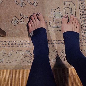 「就寝時に必ずeumeのめぐりソックスをはいて、むくみはその日のうちに解消。レーヨンシルクを使用し、気持ちのいい肌あたりも好き。旅行や出張時の飛行機内でも使用しています。」(山本さん)
