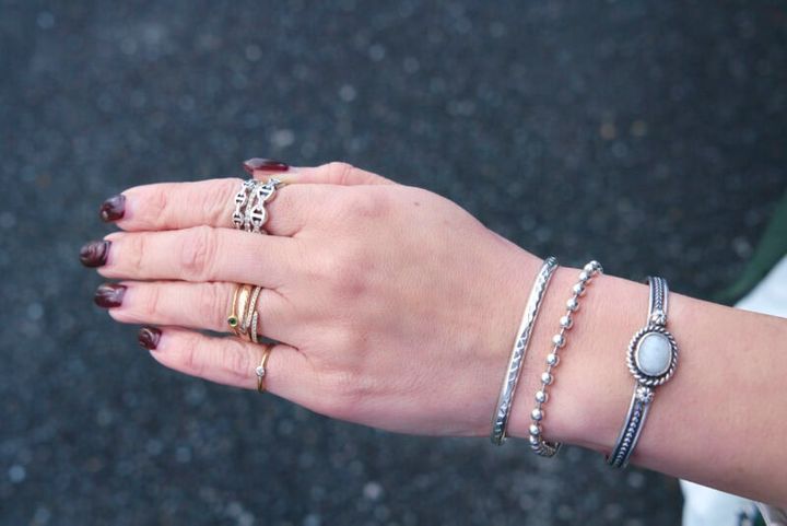 アクセサリー:ボールチェーンブレスレット/フリップ、インディアンバングル/ロンハーマンで購入したナバホジュエリー、ムーンストーンのインディアンバングル/エリッカニコラスビゲイ、左手人差し指のシルバーリング/ホーセンブース、薬指の下からフルエタニティダイヤリング/ベッティーナジャバエリ、真ん中の結婚指輪/ハワイアンジュエリー、上のダイヤリング/千葉そごうで購入、小指のエメラルドと18金のピンキーリング/ライラジュエリー