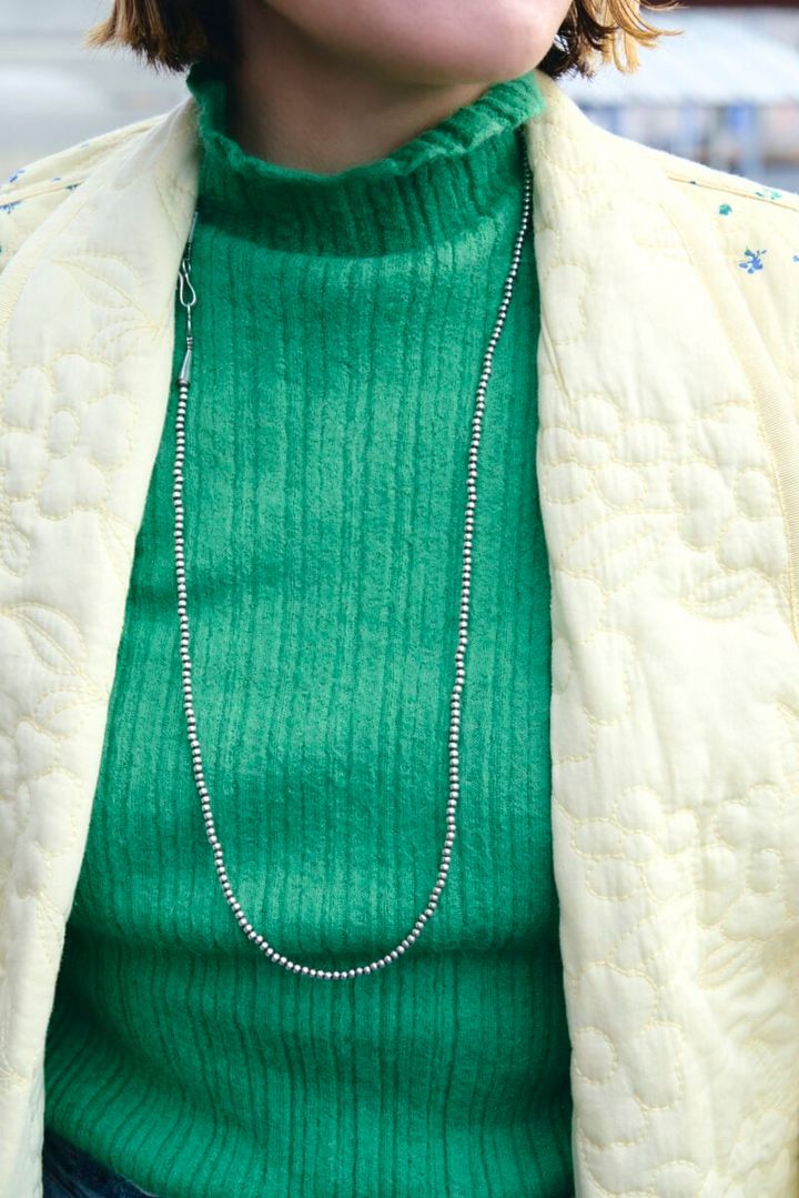 「ふつうのパールネックレスをつけると、フェミニンになりすぎるところをナバホ族発の小粒のナバホパールなら、カジュアルダウンできてこなれた感じが出せます」と川口さん。3mm玉の90cmネックレスは、シャツやワンピースにも合うし、手首に巻きつけてもおしゃれです。