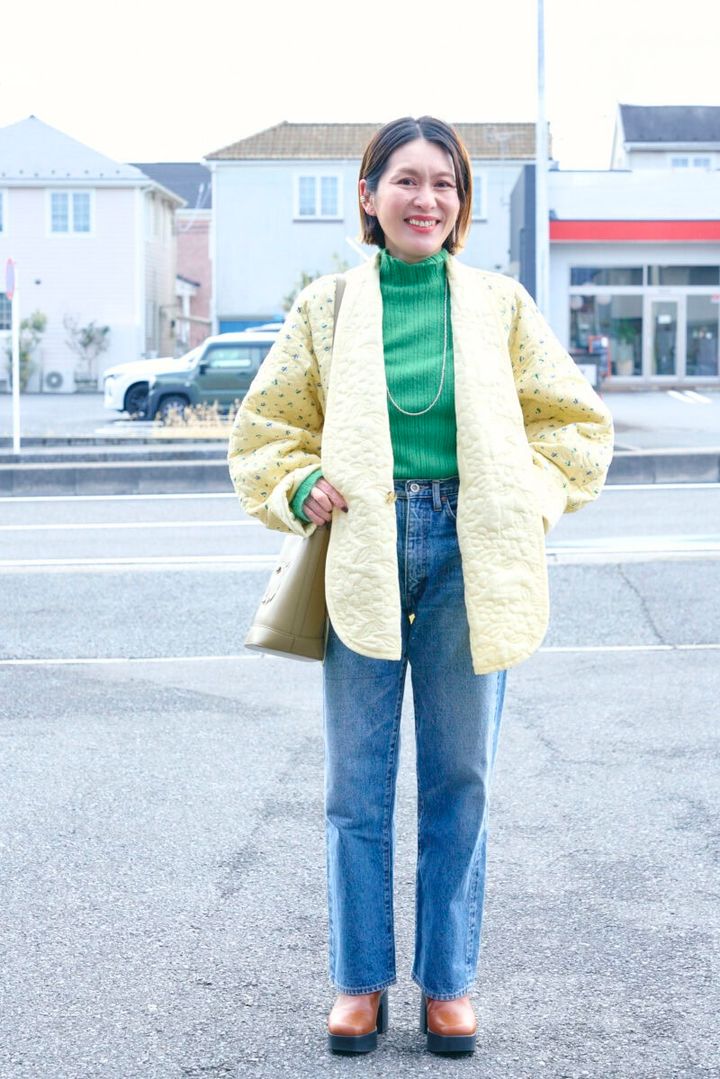 「春デニムには、メイド・イン・ジャパンのストレートを。『ボニーウーヴン』というメーカーで、生地や縫製がとてもいいんです」と川口さん。まだ肌寒い日は、アルパカのハイネックニットの上からキルティングアウターを重ねます。リバーシブルになっていて、表面は小花プリント、裏面は花の刺しゅうが施してあります。「私は身長が低めなので、オーバーサイズのアウターを着るときは、7㎝以上のヒールがあるシューズをはいてバランスをとります」と川口さん。