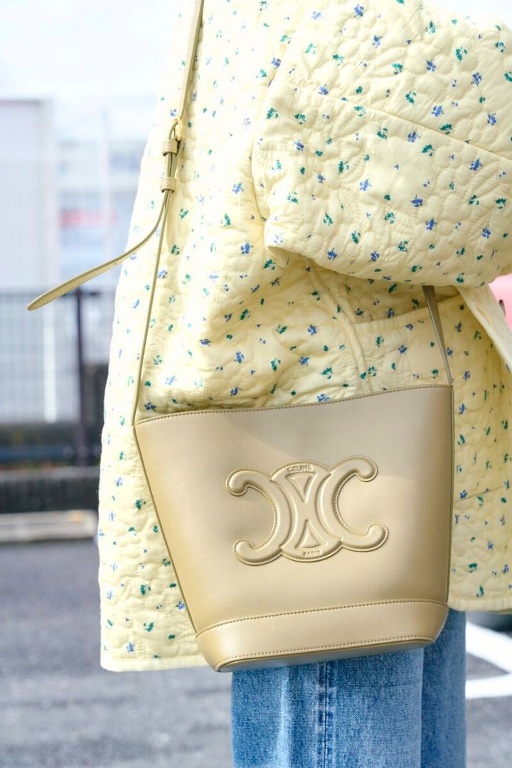 セリーヌのバケツ型レザーバッグは、どんな服装にも合わせやすいベージュ。「容量があって、手持ちもショルダーがけもできるので、よく持ってお出かけします」と川口さん。