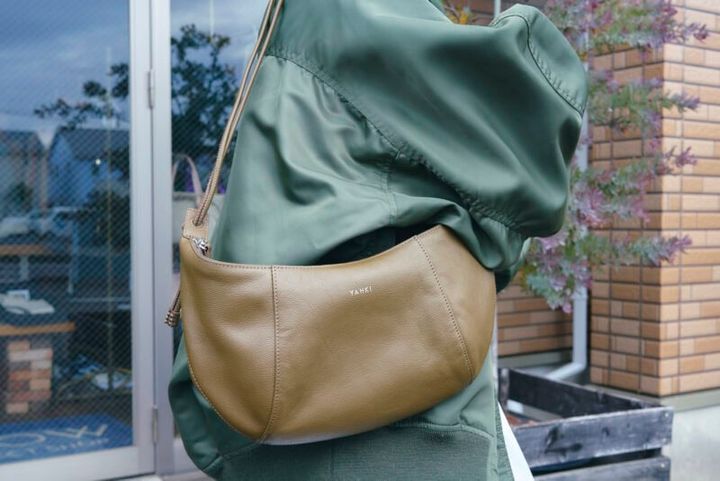 ヤーキのレザーバッグは、茶系のニュアンスカラーでカーキのMA-1に映えます。「ハーフムーンの形がボディにフィットして持ちやすくて気に入っています」(川口さん)