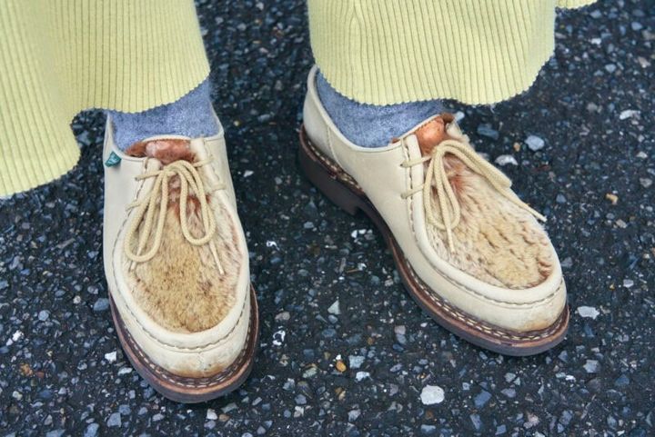 イエローのリブニットパンツに合わせて、足元は羊毛つきのチロリアンシューズを。「『ミカエル』というパラブーツを代表するモデルで、シューズのアッパーに羊毛がついていてあたたかいです」と川口さん。
