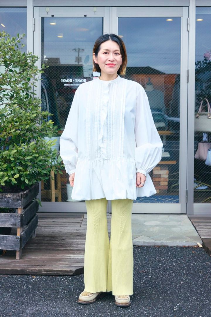 今シーズン注目のフリルブラウス。「裾がバルーンになっていて、ペプラム(ウエストから裾に向かって広がる)っぽいデザインです。このままで着ると甘くなるので、リブニットのフレアパンツを合わせました」(川口さん)