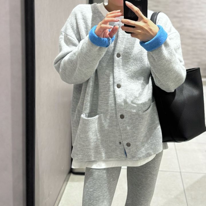 冬から春にかけての変わり目、リラックス感とおしゃれを両立したい日にぴったりなmi___.5さんのコーディネートを紹介します。目を引くのは、ライトグレーに鮮やかなブルーのパイピングが効いたカーディガンの配色です。お尻が隠れるくらいのゆるっとしたシルエットは、体型をカバーしつつ抜け感を与えてくれます。