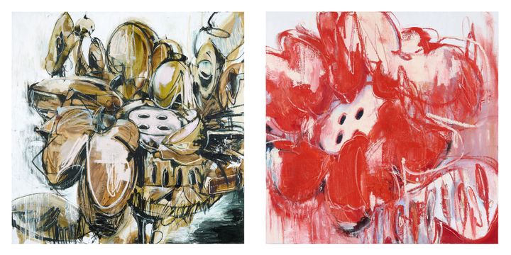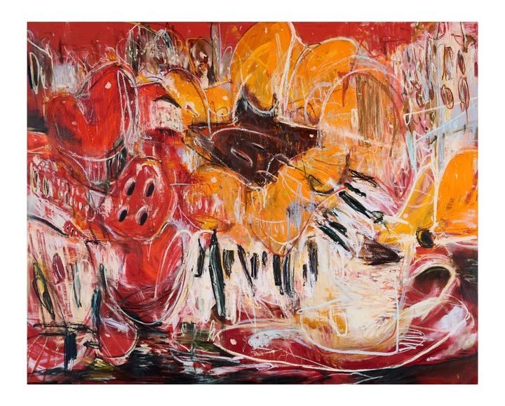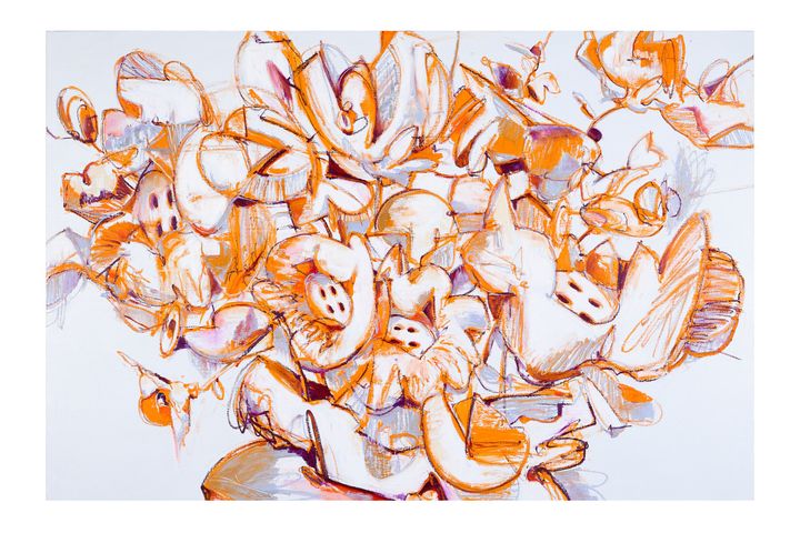 一見するとポップアートの系譜を受け継ぐ絵画群は、象徴的なモチーフである「BUTTON FLOWER」に多様なイメージを組み合わせることで、社会にポジティブな変化をもたらすことを目指しているといいます。アクリル画を中心に、近年では幼少期に少しだけ親しんだという油彩画の制作を再開し、アクリル画とは異なる深みと奥行きをもたらす色や線の表現に取り組みながら、オリジナルなスタイルを確立しています。
