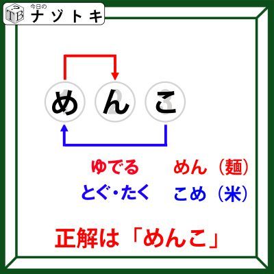 それぞれの言葉は赤は「めん(麺)」、青は「こめ(米)」です。確かにこれなら条件を満たします。