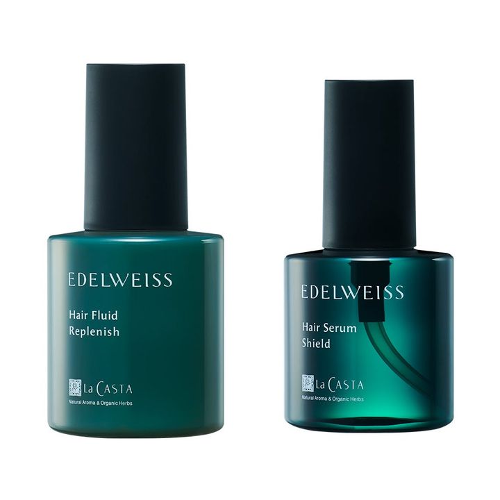 左からラ・カスタ エーデルワイス ヘアフルイド リプレニッシュ 95ml ¥4,400、同 ヘアセラム シールド 80ml ¥4,620