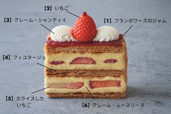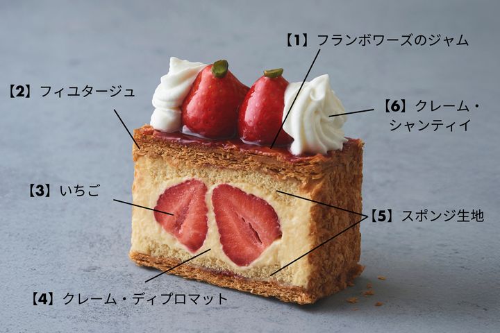 はずせないのは、風味豊かなフィユタージュ、コアントローが香る濃厚なクレーム・ディプロマット、甘酸っぱいいちご、コク深いクレーム・シャンティイ、アクセントとなるアーモンドスライス、そして秘伝のフランボワーズジャム。