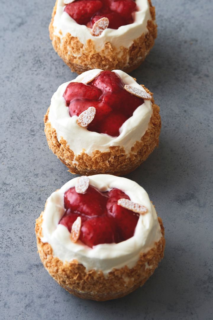 いちごがおいしい季節限定で登場する「ナポレオンパイ」は、花を思わせる愛らしい佇まいが印象的。カップ状に焼いているのは、全粒粉とライ麦粉を配合したフィユタージュ・アンヴェルセ。真ん中にもふわっと焼いたフィユタージュ・アンヴェルセが重ねられ、ザクッとした食感と香ばしさ、深みある味わいがインパクトを放つ。