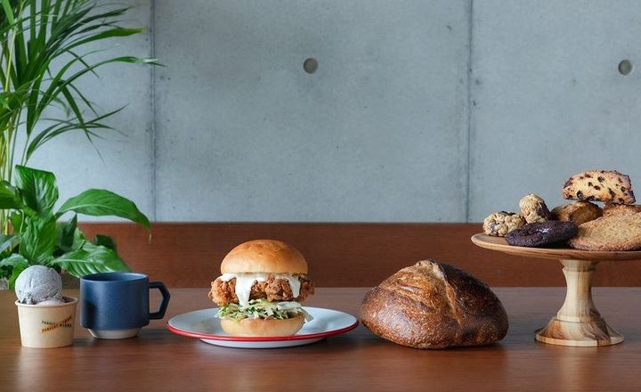 ベーカリーやバターミルクフライドチキンサンド専門店、キオスクを内包した店内では、その日の気分にあわせて料理がセレクトできるのがうれしい。ユニークなフォルムのテーブルや公園を想起させるベンチが並び、スタンディングでも着席でも気軽に立ち寄れる造りが特徴的だ。