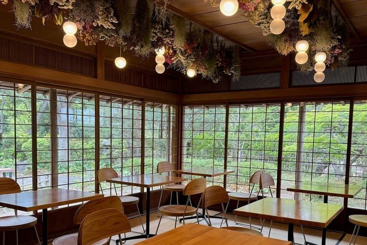 1989年に建築された茶室「好日亭」の畳を生かしつつリニューアルしたカフェ棟と、ベーカリー棟の2つからなる店舗は、ノスタルジックな雰囲気たっぷり。池を内包する日本庭園を眺めつつ、癒しのひとときを過ごそう。