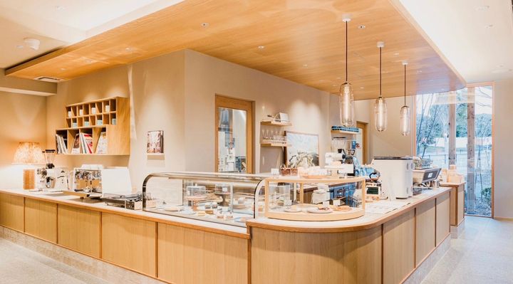 公園や自然と調和しボーダーレスにつながる空間をテーマに設計されており、ガラス張りの窓から緑を見渡せるソファ席のほか、開放感あふれるテラス席もいちおし。テラスに面したカウンターから直接注文・受け取りができるので、ランニングやペットの散歩の合い間にもスムーズに来店できる。