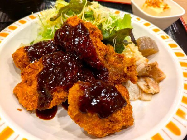 チキンカツにたっぷりとデミグラスソースがかかっています。チキンカツが5個、食べ応えがありますね~。チキンカツはオリーブオイルで揚げてあるそうです。