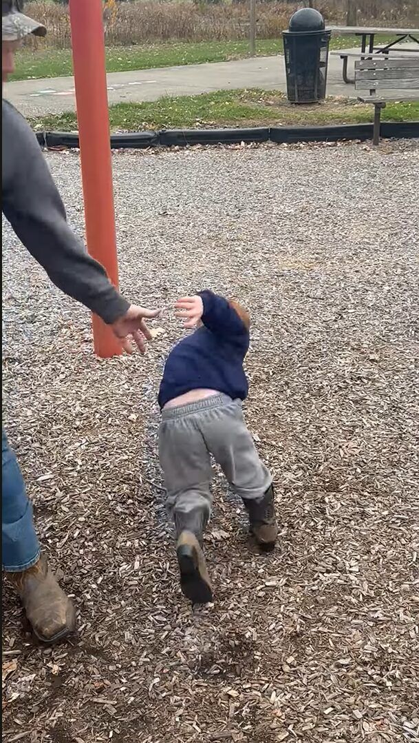 今度は、後ろ向きにフラフラ。 そんな転びそうな男の子を、パパがサポート。 後ろから手を伸ばして、転ぶ衝撃を抑えてあげるのでした。