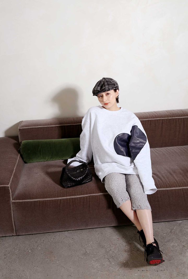 「トップスはゆとりのあるサイズを選び、フィット感高めのボトムでメリハリをつけて。足首が見えると抜け感が出て軽やかに見えるので、春は丈感でも遊びたい! コーデはオールグレーで色味は統一しつつ、素材を変えてのっぺりならないようひと工夫。黒のバッグとシューズで引き締めポイントも」トップス/ンニット、パンツ/メゾンスペシャル、バッグ/ボッテガ・ヴェネタ、ハット/ヴィンテージ、シューズ/ナイキ