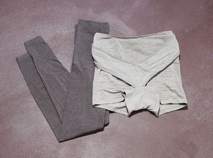「右の『犬印本舗』の肌にやさしいお腹を支えるパンツは、先輩ママであるお友だちからのプレゼント。サポートベルトがお腹を支えてくれるので、履くとお腹周りがかなりラクに! テープで調節できるのも◎。『ユニクロ』のマタニティレギンスは、家でもお出かけ着としても重宝。冷え対策として購入しましたが、履き心地も抜群でこれからママになる人に大プッシュ!」