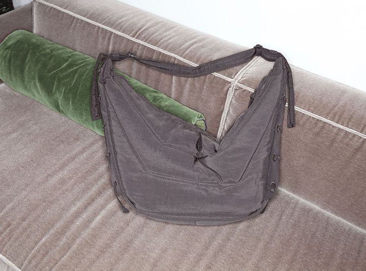 「『LEMAIRE』のバッグは夫からのプレゼント。マザーズバッグではないのですが、ナイロン生地で軽く、大容量でなんでも入るので産後も大活躍しそう! ショルダーの長さを変えられるので、肩掛けはもちろんベビーカーにかけることもできて優秀。夫ともシェアできるダークチョコレートカラーで、ファッションを選ばず使えるところもいいですね」