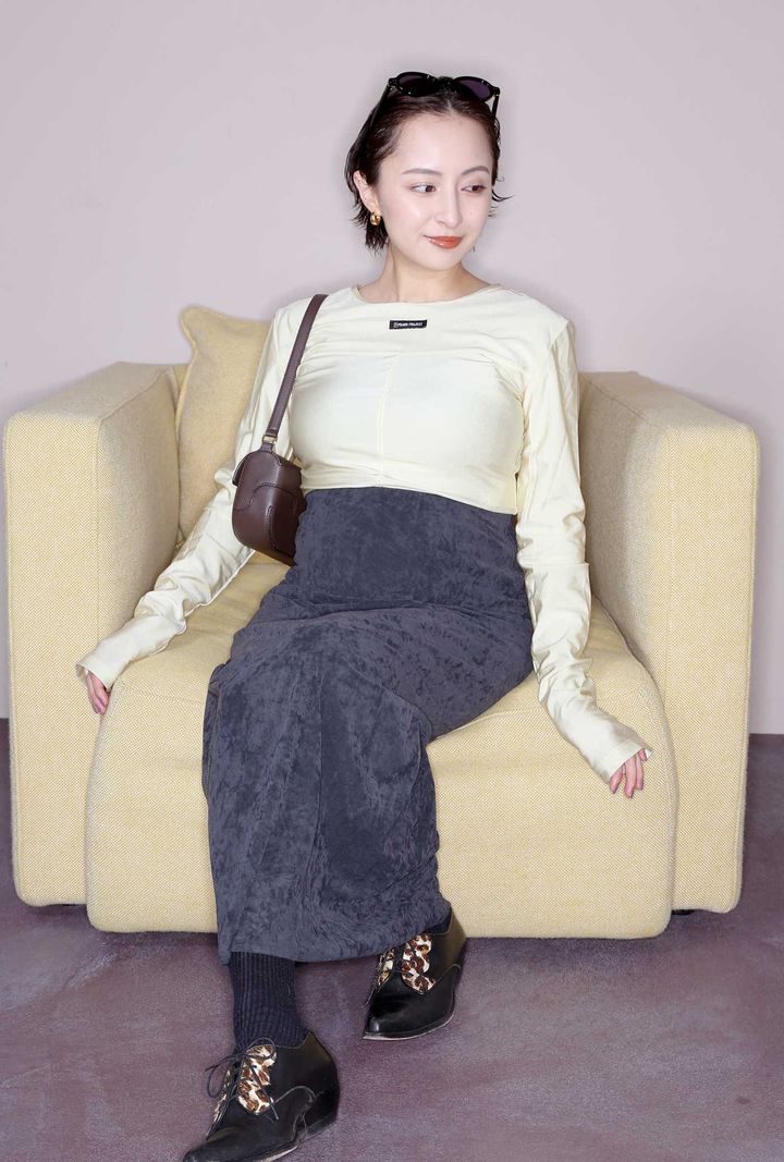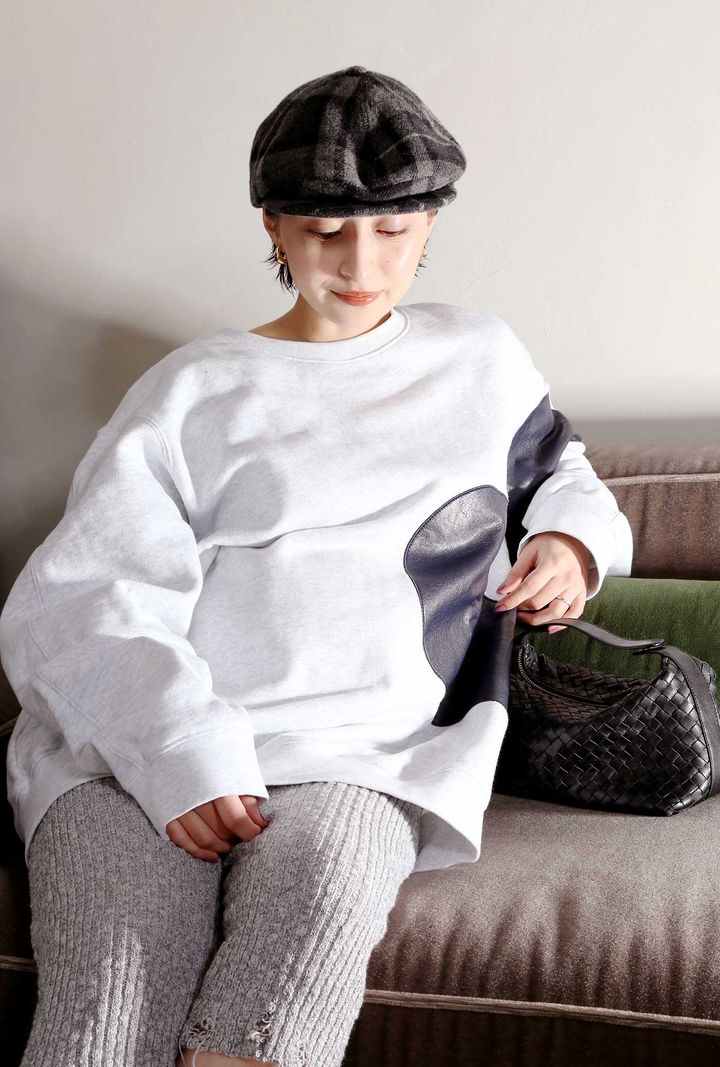 マタニティ期も自分らしく!「季節は真冬で自分が低身長なこともあり、お腹が出てくると着膨れしやすくなるだろうなと思っていて。トップスがオーバーサイズならボトムはフィットしているものを合わせたりと、バランスを意識してコーディネートを組んでいます。新たに購入したものは、『ユニクロ』のマタニティレギンスやインナーウェアぐらい。元々持っている服で、ウエスト周りがゴム製のボトムを着回したり、デニムだったらあえてボタンは全開にしてファッショナブルに振る。ぽっこりお腹が可愛く見えるような着こなしを楽しんでいます!」