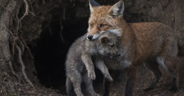 ですがキツネはすぐに再び巣穴へ入り、数秒後、子オオカミを口にくわえた状態で姿を現したのです。