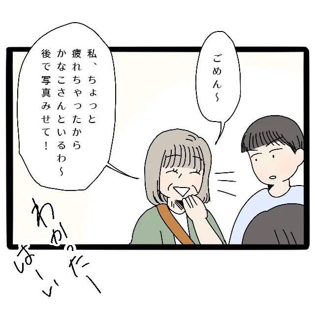 すると、突然ちよさんが「ごめん~私ちょっと疲れちゃったからかなこさんといるわ~!後で写真みせて!」と、ひとり輪から抜けて私たちのもとへ駆け寄ってきました。