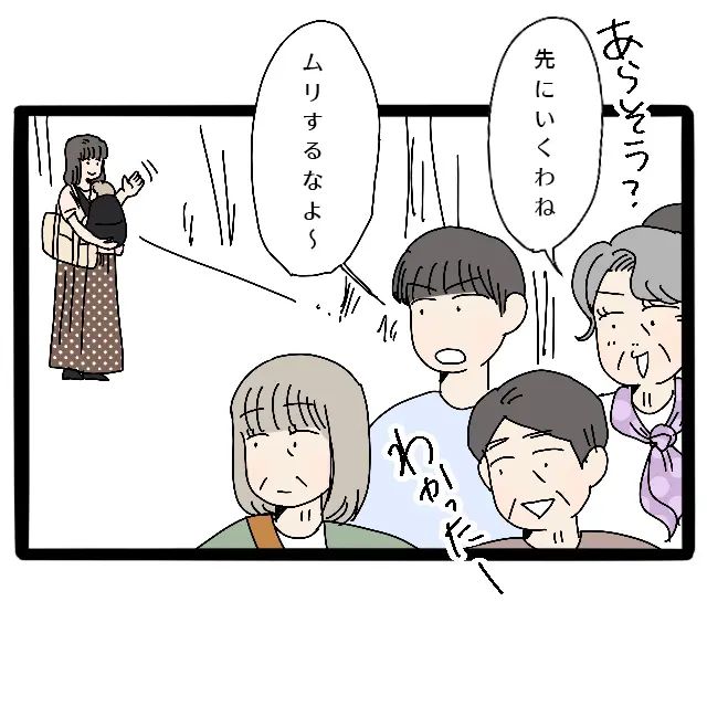 アオちゃんと荷物を抱えたかなこさんのことなど気にも留めず、スタスタと先へ進んでいく義家族とコウタさん。コウタさんにいたっては、授乳に行くと言っているのに、付き添うこともなく義家族と一緒に行ってしまいました。父親としての自覚があまりにも欠けていて呆れてしまいます。